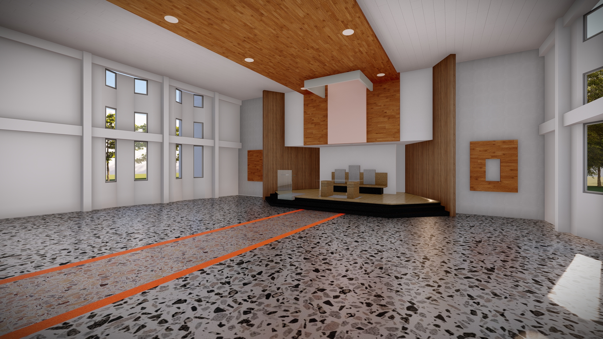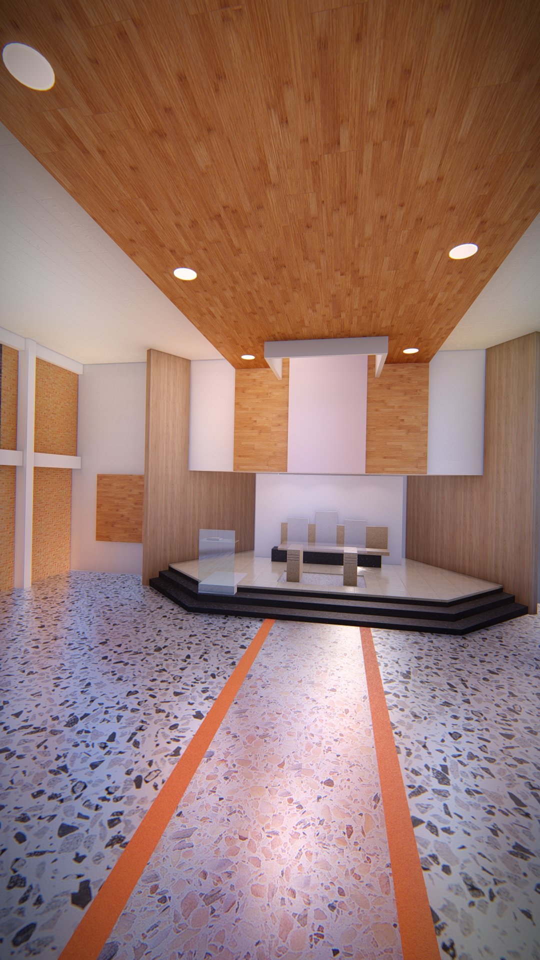 Propuesta de diseño para la actualización del presbiterio de la parroquia en conjunto con del cielo raso que articula la totalidad de la nave central que termina en en la entrada de luz cenital que resalta el altar. además de hace la remodelación y actualización de los espacios casa cural y el área de oficina.
